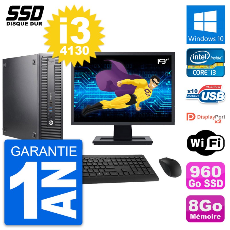 PC HP ProDesk 600 G1 SFF - Intel Core i3-4130 3.4 Ghz (3 Mo) - 8 Go DDR3 - SSD 960 Go - Clef Wifi USB - Windows 10 - Livré avec Ecran 19" + clavier + souris (Marques et modèles variables) - Garantie 1 an.
