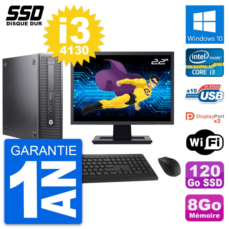 PC HP ProDesk 600 G1 SFF - Intel Core i3-4130 3.4 Ghz (3 Mo) - 8 Go DDR3 - SSD 120 Go - Clef Wifi USB - Windows 10 - Livré avec Ecran 22" + clavier + souris (Marques et modèles variables) - Garantie 1 an.