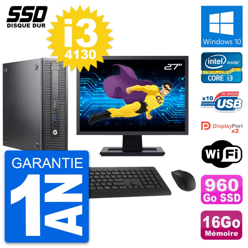 PC HP ProDesk 600 G1 SFF - Intel Core i3-4130 3.4 Ghz (3 Mo) - 16 Go DDR3 - SSD 960 Go - Clef Wifi USB - Windows 10 - Livré avec Ecran 27" + clavier + souris (Marques et modèles variables) - Garantie 1 an.