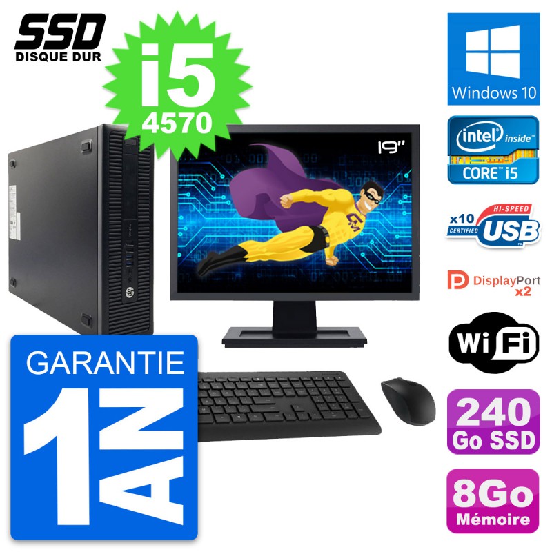 PC HP ProDesk 600 G1 SFF - Intel Core i5-4570 3.2 Ghz (6 Mo) - 8 Go DDR3 - SSD 240 Go - Clef Wifi USB - Windows 10 - Livré avec Ecran 19" + clavier + souris (Marques et modèles variables) - Garantie 1 an.