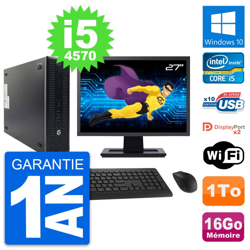 PC HP ProDesk 600 G1 SFF - Intel Core i5-4570 3.2 Ghz (6 Mo) - 16 Go DDR3 - Disque Dur 3,5" 1 To - Clef Wifi USB - Windows 10 - Livré avec Ecran 27" + clavier + souris (Marques et modèles variables) - Garantie 1 an.