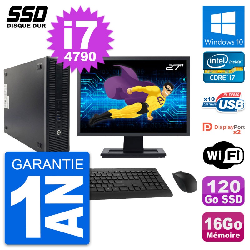 PC HP ProDesk 600 G1 SFF - Intel Core i7-4790 3.6 Ghz (8 Mo) - 16 Go DDR3 - SSD 120 Go - Clef Wifi USB - Windows 10 - Livré avec Ecran 27" + clavier + souris (Marques et modèles variables) - Garantie 1 an.