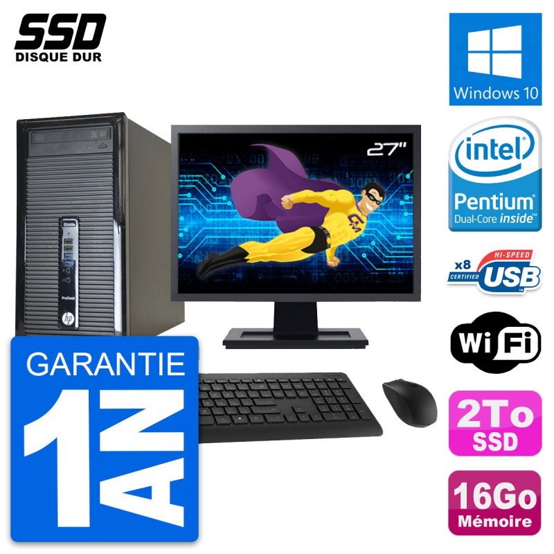 PC Tour HP ProDesk 400 G1 MT - Intel Pentium Dual-Core G3220 3.0 Ghz (3 Mo) - 16 Go DDR3 - SSD 2 To - Clef Wifi USB - Graveur DVD - Windows 10 - Livré avec Ecran 27" + clavier + souris (Marques et modèles variables) - Garantie 1 an.