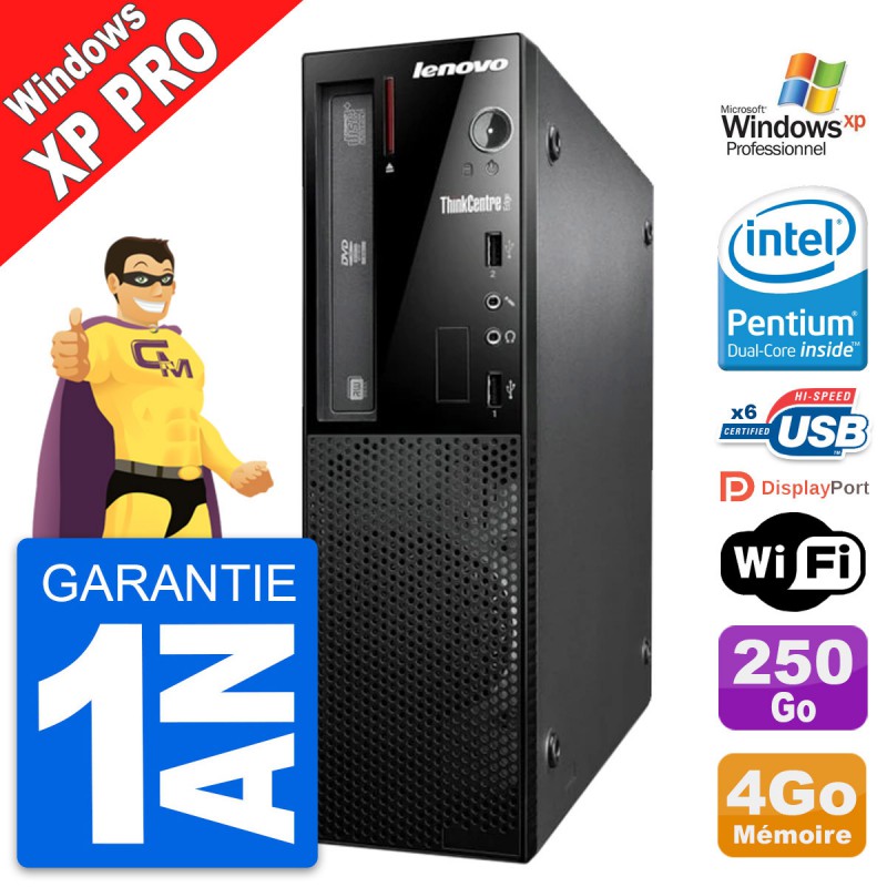 PC Lenovo ThinkCentre E73 format SFF (Slim) - Intel Pentium G3220 3.0 Ghz (3 Mo) - 4 Go DDR3 - Disque Dur 3,5" 250 Go - Graveur DVD - Windows XP Pro - Garantie 1 an.