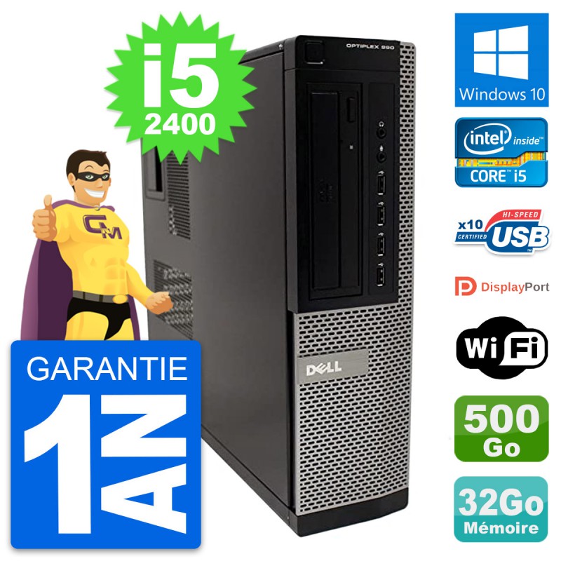 PC Dell OptiPlex 990 DT - Intel Core i5-2400 3.1 Ghz (6 Mo) - 32 Go DDR3 - Disque Dur 3,5" 500 Go - Graveur DVD - Clef Wifi USB - Windows 10 - Garantie 1 an.