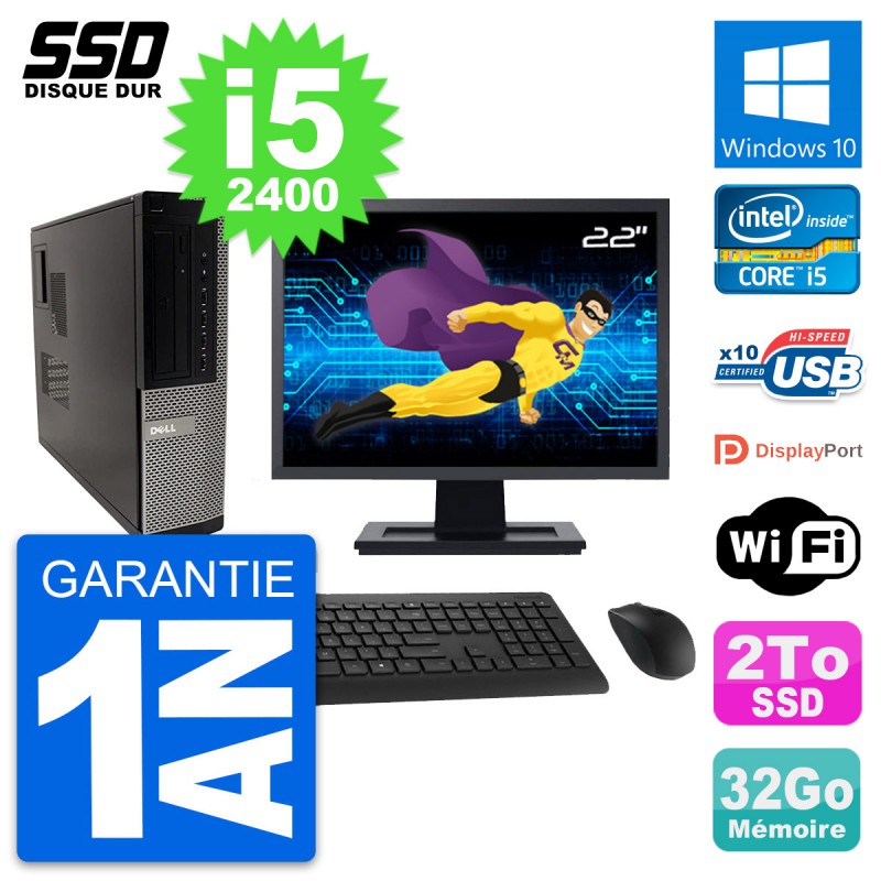 PC Dell OptiPlex 990 DT - Intel Core i5-2400 3.1 Ghz (6 Mo) - 32 Go DDR3 - SSD 2 To - Graveur DVD - Clef Wifi USB - Windows 10 - Livré avec Ecran 22" + clavier + souris (Marques et modèles variables) - Garantie 1 an.