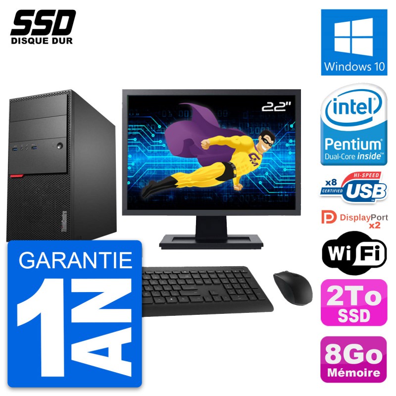 PC Tour Lenovo ThinkCentre M900 - Intel Pentium Dual-Core G4400 3.3 Ghz (3 Mo) - 8 Go DDR4 - SSD 2 To - Clef Wifi USB - Windows 10 - Livré avec Ecran 22" + clavier + souris (Marques et modèles variables) - Garantie 1 an.