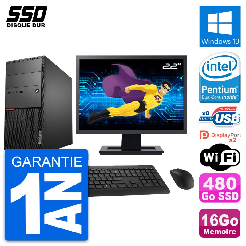 PC Tour Lenovo ThinkCentre M900 - Intel Pentium Dual-Core G4400 3.3 Ghz (3 Mo) - 16 Go DDR4 - SSD 480 Go - Clef Wifi USB - Windows 10 - Livré avec Ecran 22" + clavier + souris (Marques et modèles variables) - Garantie 1 an.