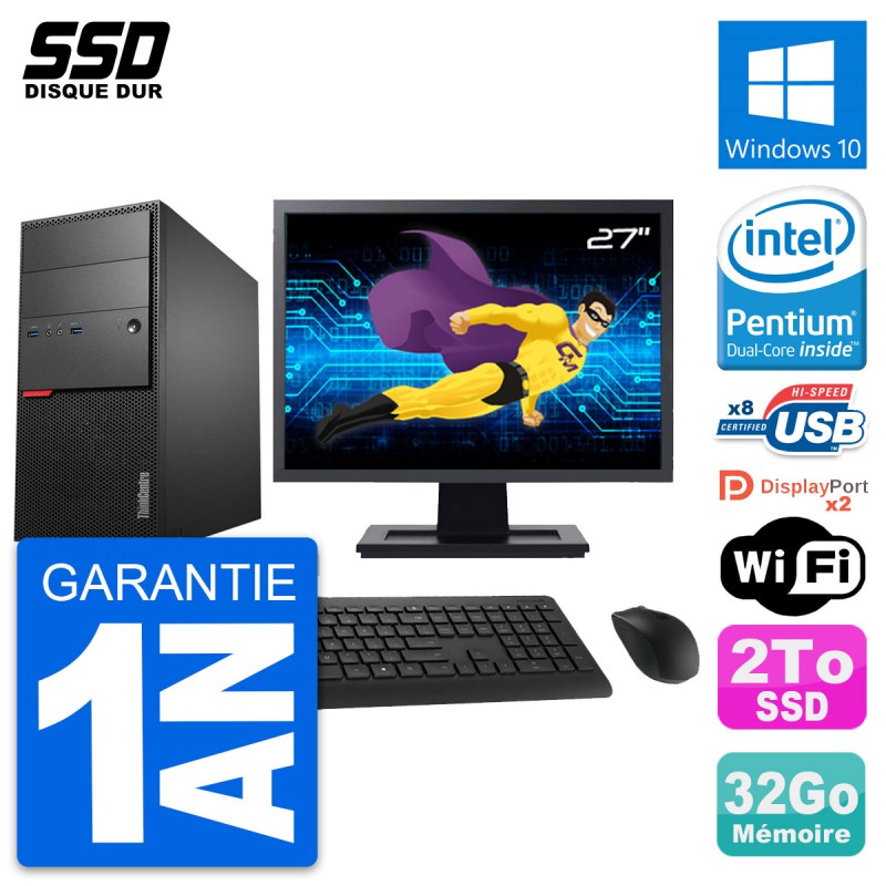 PC Tour Lenovo ThinkCentre M900 - Intel Pentium Dual-Core G4400 3.3 Ghz (3 Mo) - 32 Go DDR4 - SSD 2 To - Clef Wifi USB - Windows 10 - Livré avec Ecran 27" + clavier + souris (Marques et modèles variables) - Garantie 1 an.