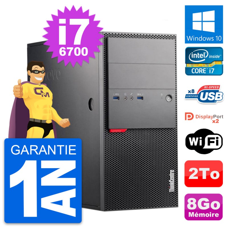 PC Tour Lenovo ThinkCentre M900 - Intel Core i7-6700 3.4 Ghz (8 Mo) - 8 Go DDR4 - Disque Dur 3,5" 2 To - Clef Wifi USB - Windows 10 - Garantie 1 an.