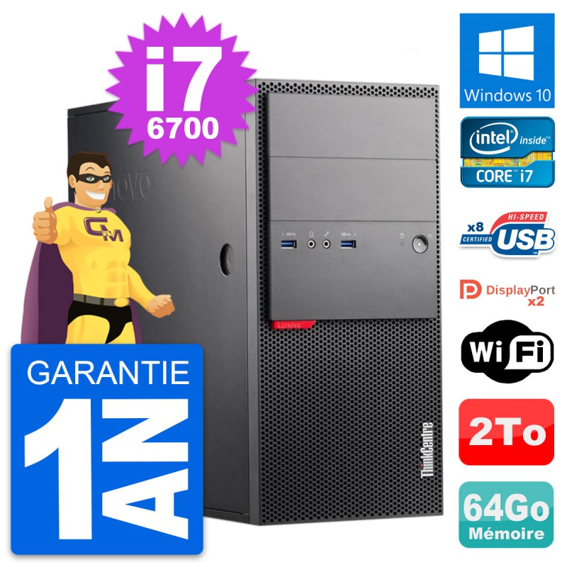 PC Tour Lenovo ThinkCentre M900 - Intel Core i7-6700 3.4 Ghz (8 Mo) - 64 Go DDR4 - Disque Dur 3,5" 2 To - Clef Wifi USB - Windows 10 - Garantie 1 an.