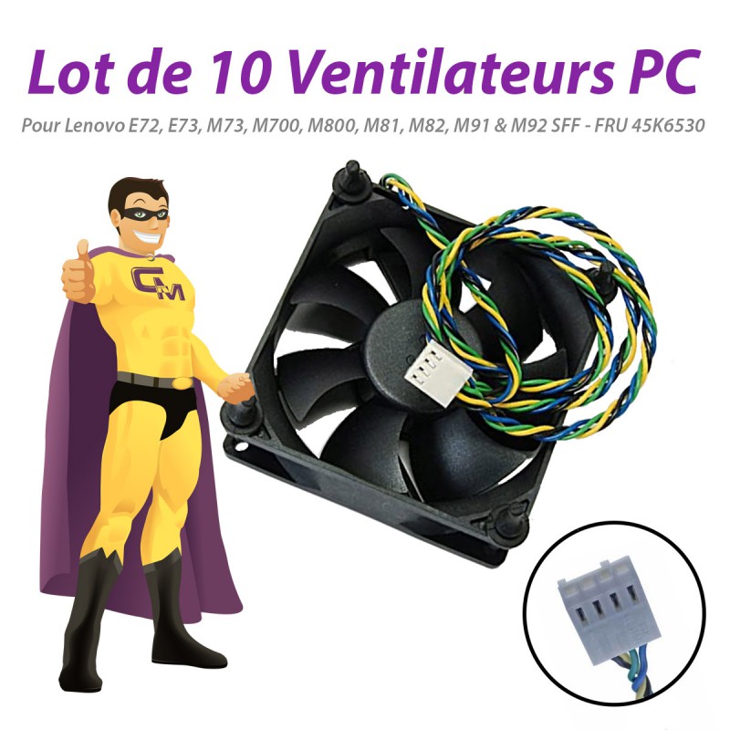 Lot de 10 Ventilateurs pour PC - Lenovo - P/N FRU 45K6530 - 80x80x25 mm - 4-Pin / Fil 60 cm - Pour PC Lenovo ThinkCentre M57e, M70e, M73, E72, E73, M700, M800, M81, M82, M91p et M92p format SFF (slim) - Garantis 6 mois.