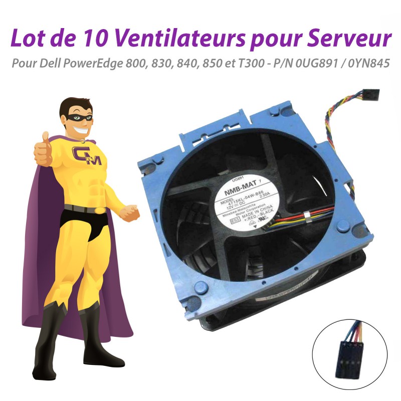 Lot de 10 Ventilateurs pour Serveur - Dell - P/N 0UG891 / UG891 - Avec Adaptateur 0YN845 / YN845 - 4-Pin - 120x120x38mm - Pour serveur Dell PowerEdge 800, 830, 840, 850 et T300 - Garantis 6 mois.