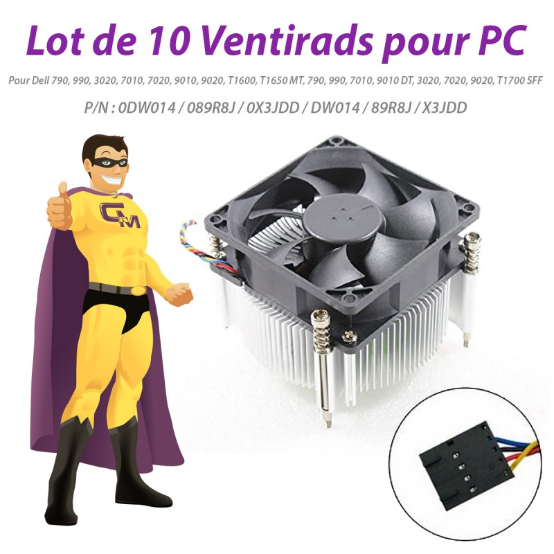 Lot de 10 Ventirads processeur pour PC Dell Optiplex 3020, 7020, 9020 SFF (Slim), 790, 990, 7010 et 9010 DT (DeskTop) et 790, 990, 3020, 7010, 7020, 9010 et 9020, Precision T1600, T1650 Tour - P/N 0DW014 / 089R8J / 0X3JDD - Garantis 6 mois.