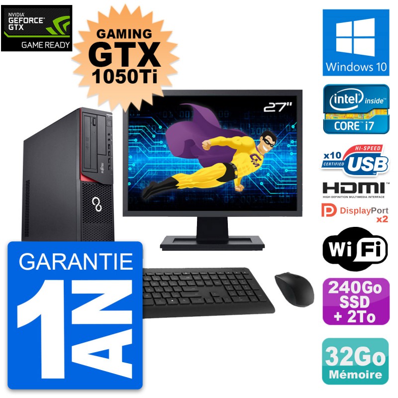PC Gaming Fujitsu E920 DT - Intel Core i7-4790 3.6 Ghz - Nvidia GTX 1050 Ti 4Go - 32 Go DDR3 - SSD 240 Go + Disque dur 2To - DVD - Clef Wifi USB - Windows 10 - Livré avec Ecran 27" + clavier + souris (Marques et modèles variables) - Garantie 1 an.