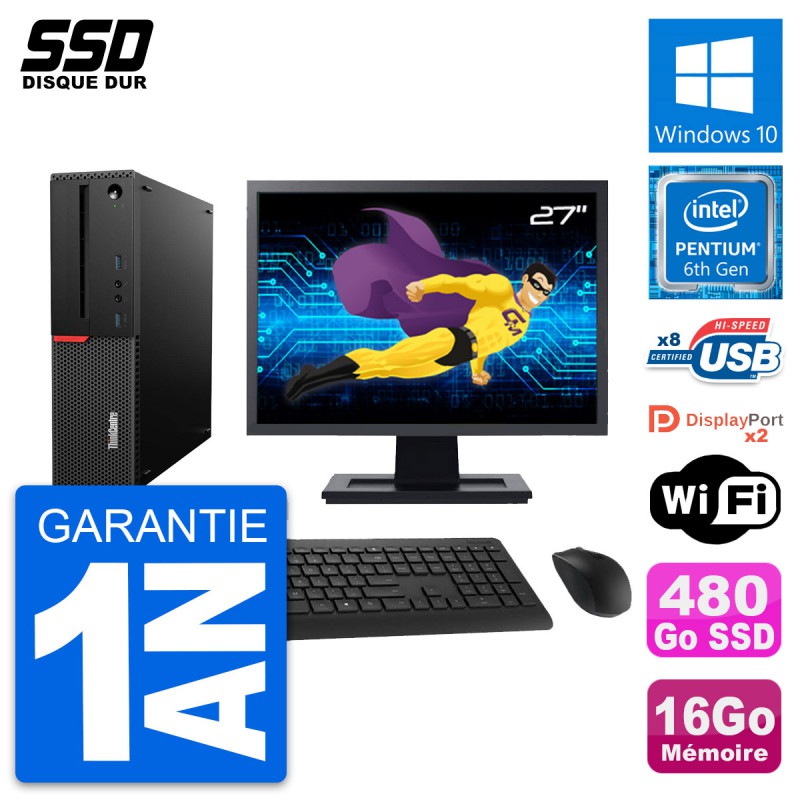 PC Lenovo ThinkCentre M800 SFF - Intel Pentium Dual-Core G4400 3.3 Ghz (3 Mo) - 16 Go DDR4 - SSD 480 Go - Clef Wifi USB - Windows 10 - Livré avec Ecran 27" + clavier + souris (Marques et modèles variables) - Garantie 1 an.