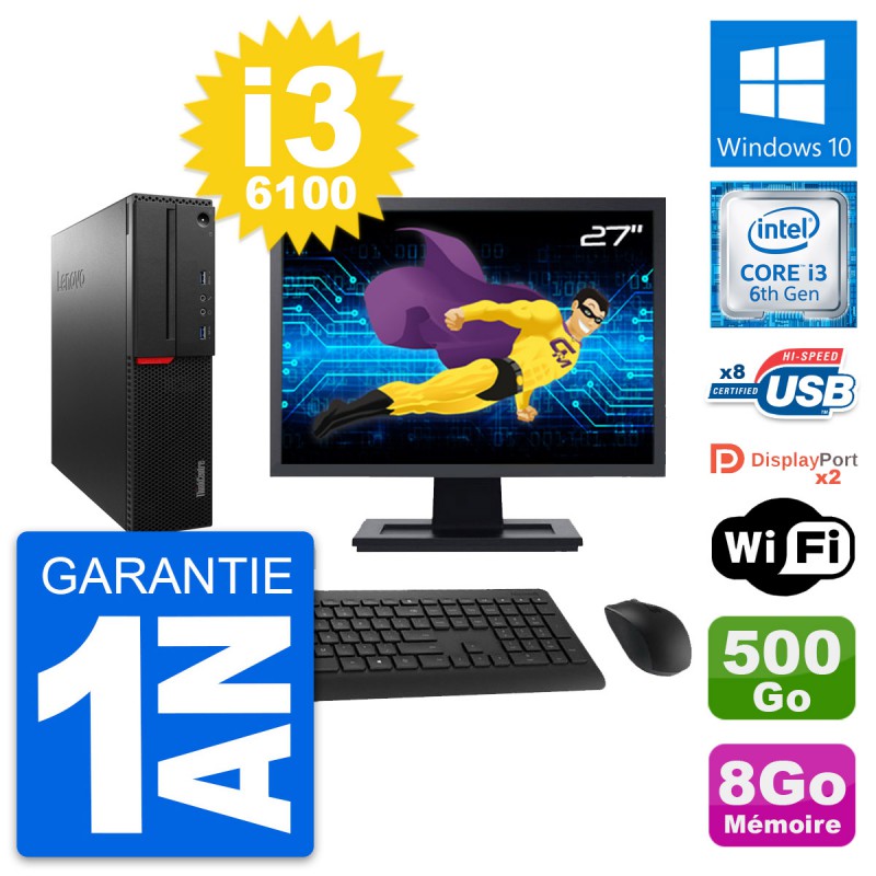PC Lenovo ThinkCentre M800 SFF - Intel Core i3-6100 3.7 Ghz (3 Mo) - 8 Go DDR4 - Disque Dur 3,5" 500 Go - Clef Wifi USB - Windows 10 - Livré avec Ecran 27" + clavier + souris (Marques et modèles variables) - Garantie 1 an.