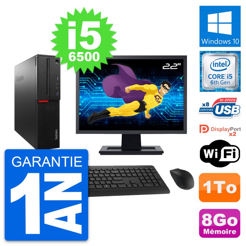 PC Lenovo ThinkCentre M800 SFF - Intel Core i5-6500 3.2 Ghz (6 Mo) - 8 Go DDR4 - Disque Dur 3,5" 1 To - Clef Wifi USB - Windows 10 - Livré avec Ecran 22" + clavier + souris (Marques et modèles variables) - Garantie 1 an.