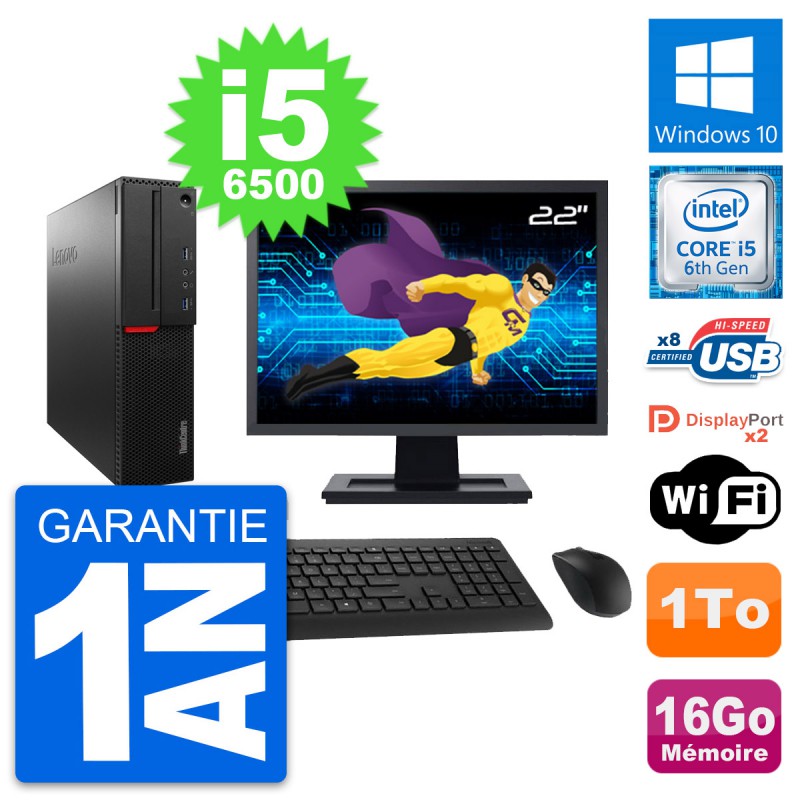 PC Lenovo ThinkCentre M800 SFF - Intel Core i5-6500 3.2 Ghz (6 Mo) - 16 Go DDR4 - Disque Dur 3,5" 1 To - Clef Wifi USB - Windows 10 - Livré avec Ecran 22" + clavier + souris (Marques et modèles variables) - Garantie 1 an.