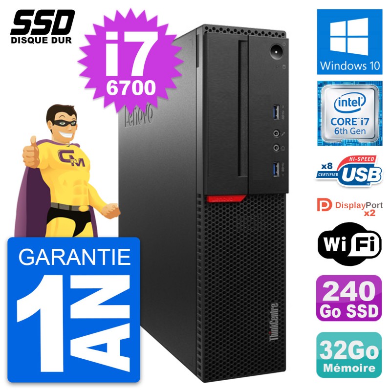 PC Lenovo ThinkCentre M800 SFF - Intel Core i7-6700 3.4 Ghz (8 Mo) - 32 Go DDR4 - SSD 240 Go - Clef Wifi USB - Windows 10 - Garantie 1 an.