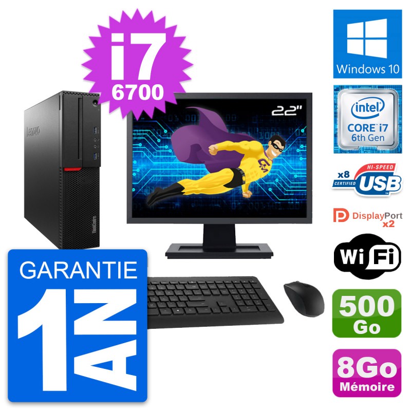PC Lenovo ThinkCentre M800 SFF - Intel Core i7-6700 3.4 Ghz (8 Mo) - 8 Go DDR4 - Disque Dur 3,5" 500 Go - Clef Wifi USB - Windows 10 - Livré avec Ecran 22" + clavier + souris (Marques et modèles variables) - Garantie 1 an.