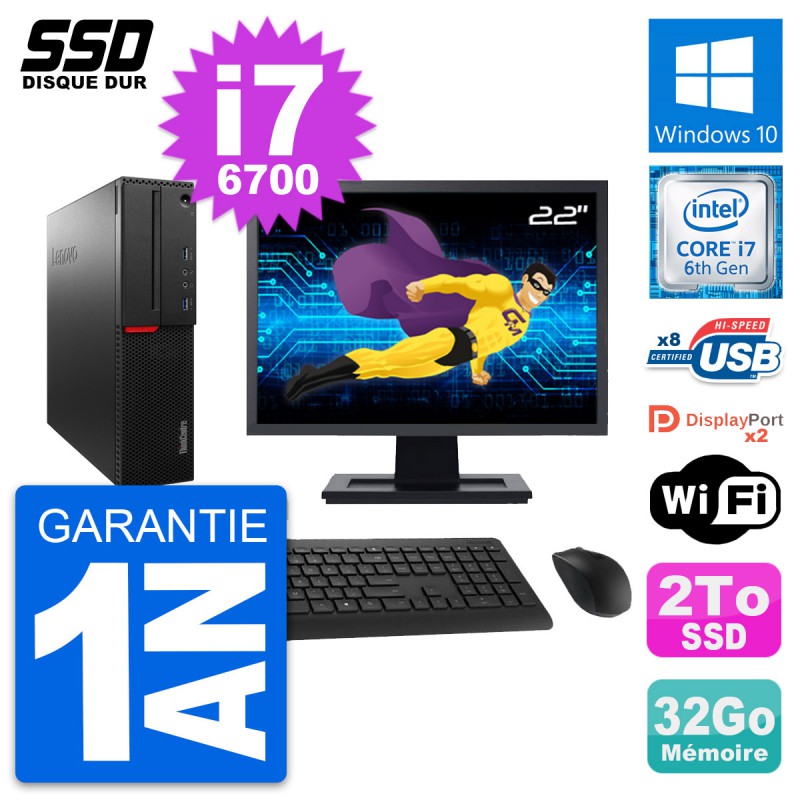 PC Lenovo ThinkCentre M800 SFF - Intel Core i7-6700 3.4 Ghz (8 Mo) - 32 Go DDR4 - SSD 2 To - Clef Wifi USB - Windows 10 - Livré avec Ecran 22" + clavier + souris (Marques et modèles variables) - Garantie 1 an.