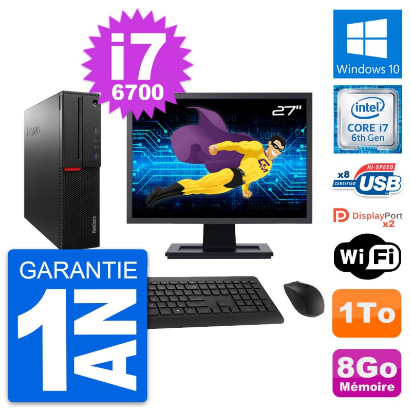 PC Lenovo ThinkCentre M800 SFF - Intel Core i7-6700 3.4 Ghz (8 Mo) - 8 Go DDR4 - Disque Dur 3,5" 1 To - Clef Wifi USB - Windows 10 - Livré avec Ecran 27" + clavier + souris (Marques et modèles variables) - Garantie 1 an.