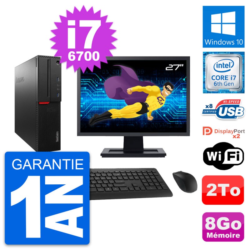 PC Lenovo ThinkCentre M800 SFF - Intel Core i7-6700 3.4 Ghz (8 Mo) - 8 Go DDR4 - Disque Dur 3,5" 2 To - Clef Wifi USB - Windows 10 - Livré avec Ecran 27" + clavier + souris (Marques et modèles variables) - Garantie 1 an.
