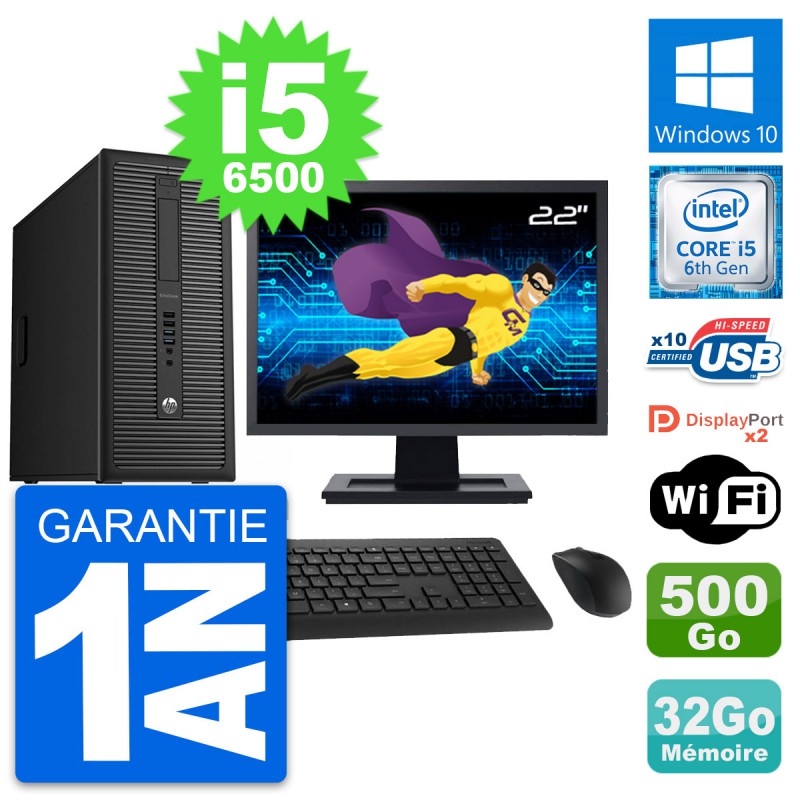 PC Tour HP 800 G2 Ecran 22" Intel i5-6500 RAM 32Go Disque 500Go Windows 10 Wifi