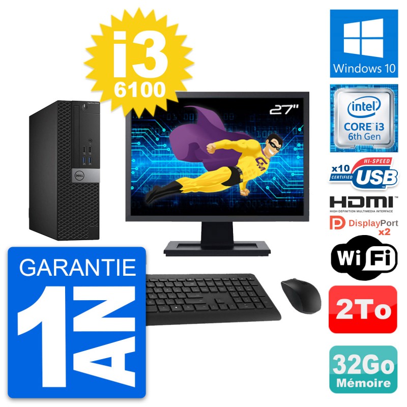 PC Dell OptiPlex 5040 SFF - Intel Core i3-6100 3.7 Ghz (3 Mo) - 32 Go DDR3L - Disque Dur 3,5" 2 To - Clef Wifi USB - Windows 10 - Livré avec Ecran 27" + clavier + souris (Marques et modèles variables) - Garantie 1 an.