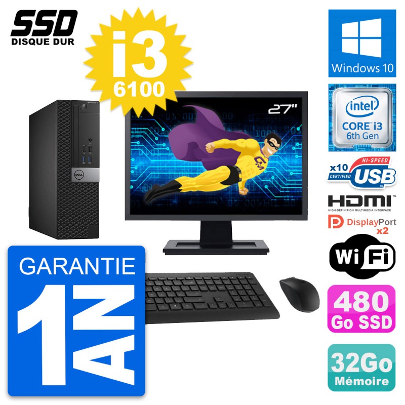 PC Dell OptiPlex 5040 SFF - Intel Core i3-6100 3.7 Ghz (3 Mo) - 32 Go DDR3L - SSD 480 Go - Clef Wifi USB - Windows 10 - Livré avec Ecran 27" + clavier + souris (Marques et modèles variables) - Garantie 1 an.