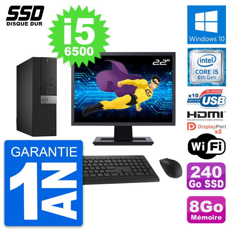 PC Dell OptiPlex 5040 SFF - Intel Core i5-6500 3.2 Ghz (6 Mo) - 8 Go DDR3L - SSD 240 Go - Clef Wifi USB - Windows 10 - Livré avec Ecran 22" + clavier + souris (Marques et modèles variables) - Garantie 1 an.