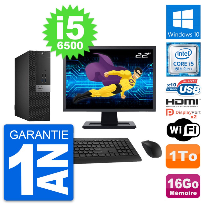 PC Dell OptiPlex 5040 SFF - Intel Core i5-6500 3.2 Ghz (6 Mo) - 16 Go DDR3L - Disque Dur 3,5" 1 To - Clef Wifi USB - Windows 10 - Livré avec Ecran 22" + clavier + souris (Marques et modèles variables) - Garantie 1 an.