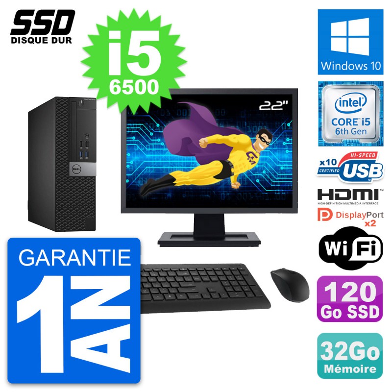 PC Dell OptiPlex 5040 SFF - Intel Core i5-6500 3.2 Ghz (6 Mo) - 32 Go DDR3L - SSD 120 Go - Clef Wifi USB - Windows 10 - Livré avec Ecran 22" + clavier + souris (Marques et modèles variables) - Garantie 1 an.