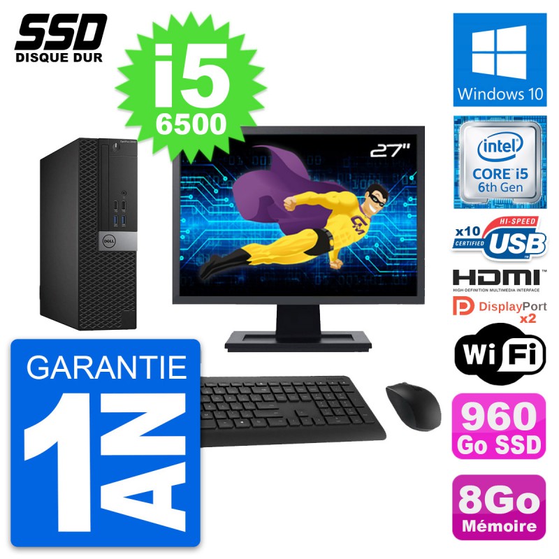 PC Dell OptiPlex 5040 SFF - Intel Core i5-6500 3.2 Ghz (6 Mo) - 8 Go DDR3L - SSD 960 Go - Clef Wifi USB - Windows 10 - Livré avec Ecran 27" + clavier + souris (Marques et modèles variables) - Garantie 1 an.