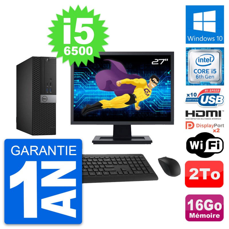 PC Dell OptiPlex 5040 SFF - Intel Core i5-6500 3.2 Ghz (6 Mo) - 16 Go DDR3L - Disque Dur 3,5" 2 To - Clef Wifi USB - Windows 10 - Livré avec Ecran 27" + clavier + souris (Marques et modèles variables) - Garantie 1 an.