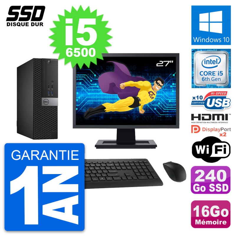 PC Dell OptiPlex 5040 SFF - Intel Core i5-6500 3.2 Ghz (6 Mo) - 16 Go DDR3L - SSD 240 Go - Clef Wifi USB - Windows 10 - Livré avec Ecran 27" + clavier + souris (Marques et modèles variables) - Garantie 1 an.