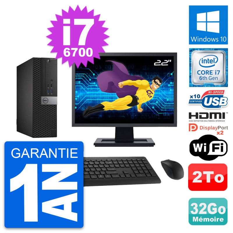 PC Dell OptiPlex 5040 SFF - Intel Core i7-6700 3.4 Ghz (8 Mo) - 32 Go DDR3L - Disque Dur 3,5" 2 To - Clef Wifi USB - Windows 10 - Livré avec Ecran 22" + clavier + souris (Marques et modèles variables) - Garantie 1 an.