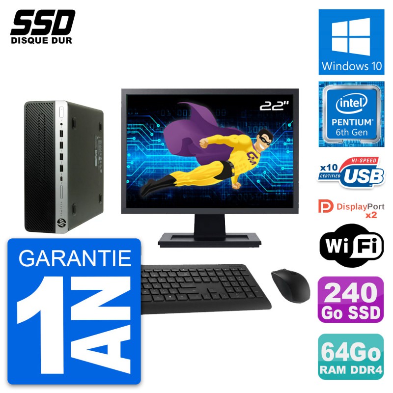 PC HP ProDesk 600 G3 SFF - Intel Pentium Dual-Core G4400 3.3 Ghz (3 Mo) - 64 Go DDR4 - SSD 240 Go - Clef Wifi USB - Windows 10 - Livré avec Ecran 22" + clavier + souris (Marques et modèles variables) - Garantie 1 an.