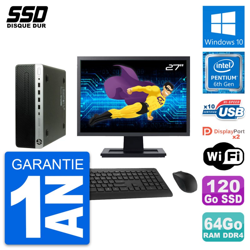 PC HP ProDesk 600 G3 SFF - Intel Pentium Dual-Core G4400 3.3 Ghz (3 Mo) - 64 Go DDR4 - SSD 120 Go - Clef Wifi USB - Windows 10 - Livré avec Ecran 27" + clavier + souris (Marques et modèles variables) - Garantie 1 an.