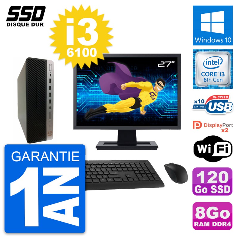 PC HP ProDesk 600 G3 SFF - Intel Core i3-6100 3.7 Ghz (3 Mo) - 8 Go DDR4 - SSD 120 Go - Clef Wifi USB - Windows 10 - Livré avec Ecran 27" + clavier + souris (Marques et modèles variables) - Garantie 1 an.