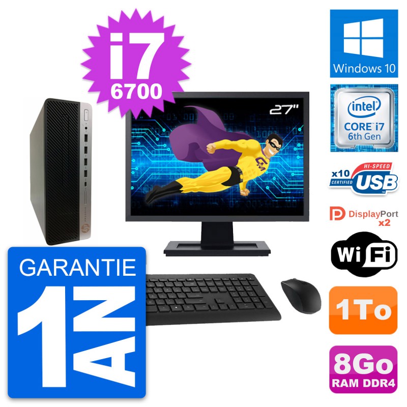PC HP ProDesk 600 G3 SFF - Intel Core i7-6700 3.4 Ghz (8 Mo) - 8 Go DDR4 - Disque Dur 3,5" 1 To - Clef Wifi USB - Windows 10 - Livré avec Ecran 27" + clavier + souris (Marques et modèles variables) - Garantie 1 an.