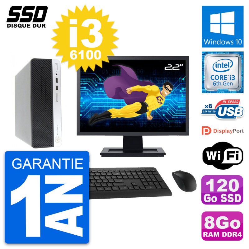 PC HP ProDesk 400 G4 SFF Ecran 22" i3-6100 RAM 8Go SSD 120Go Windows 10 Wifi