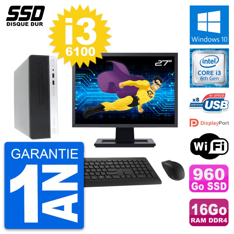 PC HP ProDesk 400 G4 SFF - Intel Core i3-6100 3.7 Ghz (3 Mo) - 16 Go DDR4 - SSD 960 Go - Clef Wifi USB - Windows 10 - Livré avec Ecran 27" + clavier + souris (Marques et modèles variables) - Garantie 1 an.