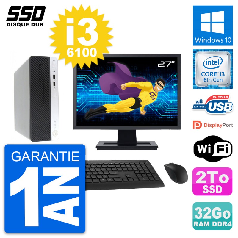 PC HP ProDesk 400 G4 SFF Ecran 27" Core i3-6100 RAM 32Go SSD 2To Windows 10 Wifi