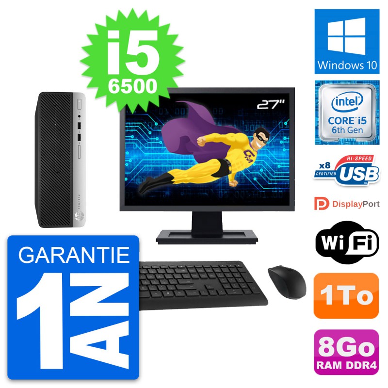 PC HP ProDesk 400 G4 SFF - Intel Core i5-6500 3.2 Ghz (6 Mo) - 8 Go DDR4 - Disque Dur 3,5" 1 To - Clef Wifi USB - Windows 10 - Livré avec Ecran 27" + clavier + souris (Marques et modèles variables) - Garantie 1 an.