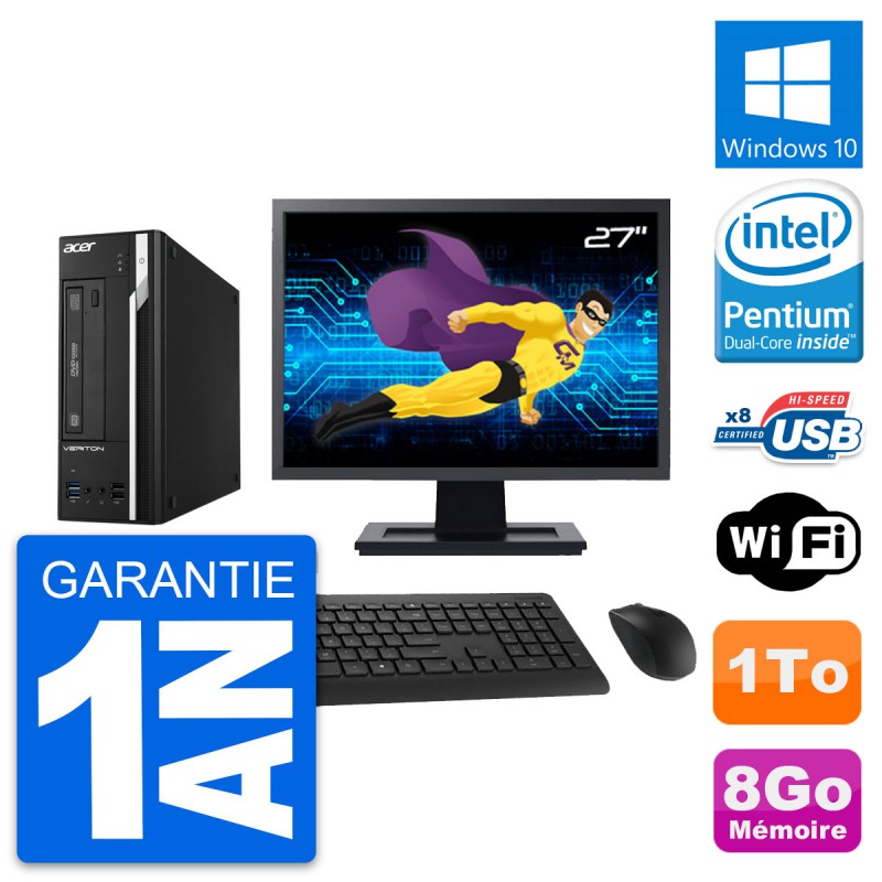 PC Acer Veriton X2632G SFF (slim) - Intel Pentium Dual-Core G3220 3.0 Ghz (3 Mo) - 8 Go DDR3 - Disque Dur 3,5" 1 To - Clef Wifi USB - Graveur DVD - Windows 10 - Livré avec Ecran 27" + clavier + souris (Marques et modèles variables) - Garantie 1 an.