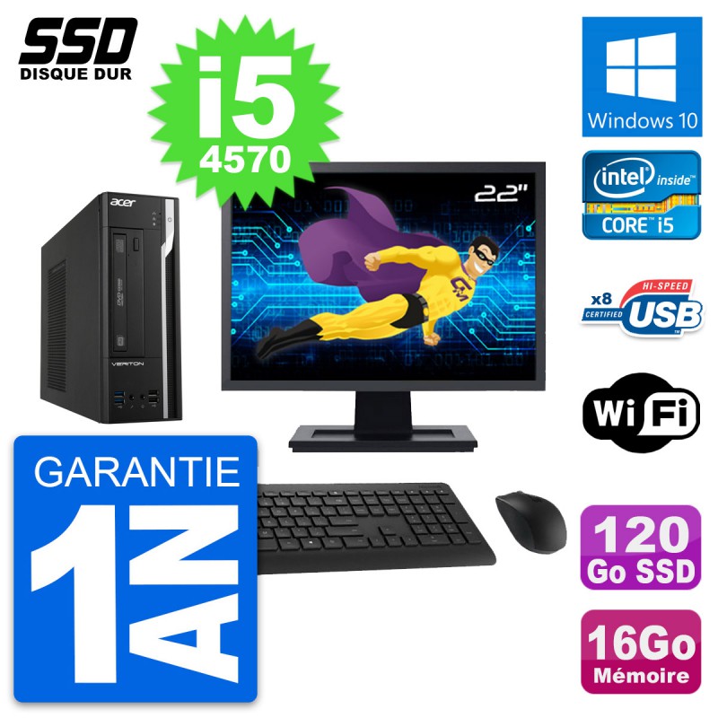 PC Acer Veriton X2632G SFF (slim) - Intel Core i5-4570 3.2 Ghz (6 Mo) - 16 Go DDR3 - SSD 120 Go - Clef Wifi USB - Graveur DVD - Windows 10 - Livré avec Ecran 22" + clavier + souris (Marques et modèles variables) - Garantie 1 an.