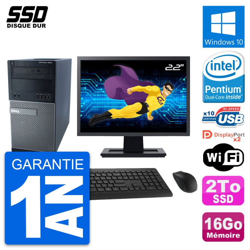 PC Dell 9020 MT - Intel Pentium Dual-Core G3220 3.0 Ghz (3 Mo) - 16 Go DDR3 - SSD 2 To - Graveur DVD - Clef Wifi USB - Windows 10 - Livré avec Ecran 22" + clavier + souris (Marques et modèles variables) - Garantie 1 an.