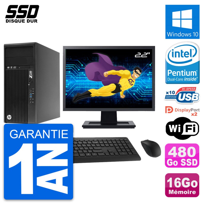 PC Tour HP WorkStation Z230 - Intel Pentium Dual-Core G3220 3.0 Ghz (3 Mo) - 16 Go DDR3 - SSD 480 Go - Graveur DVD - Clef Wifi USB - Windows 10 - Livré avec Ecran 22" + clavier + souris (Marques et modèles variables) - Garantie 1 an.